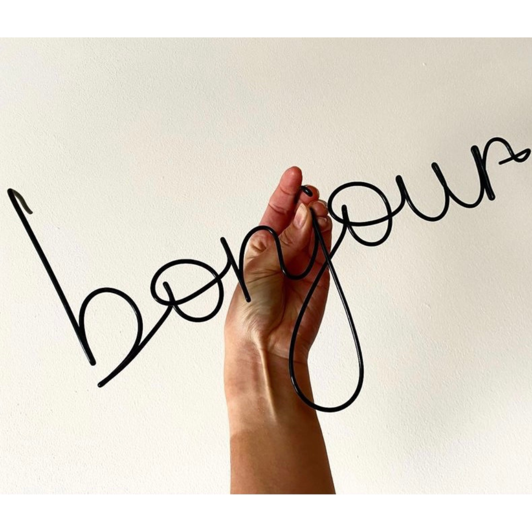 "Bonjour" wall accessory. Great alternative to a print or picture hanging. Bellinda font. I recommend floating display for this listing.