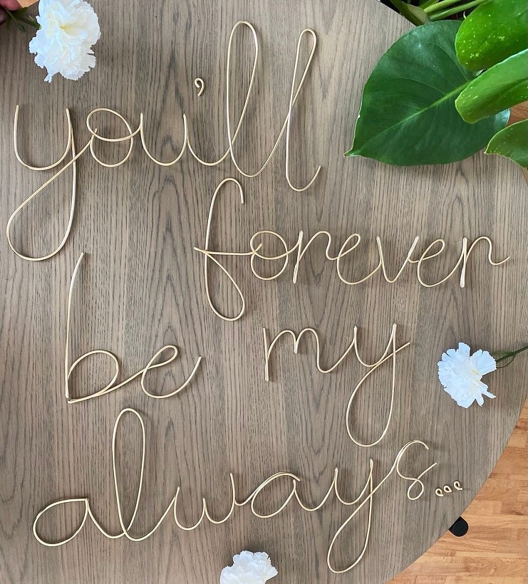 “you’ll forever be my always” wire writing in Bellinda font. Pictured is size medium: At it’s tallest points this design in small is 3 inches tall. If you select size medium this is 4.5 inches tall at its tallest points. If you select size large this is 6 inches tall at its tallest points.